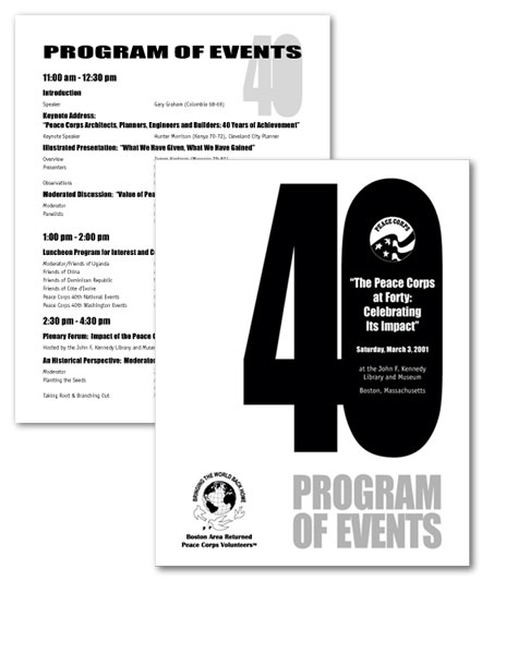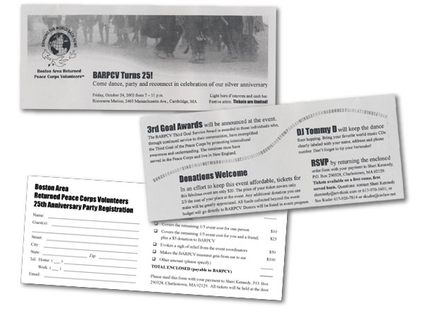 PRINT SAMPLES Following are a few samples of printed work. The pieces on this page were designed for the non-profit organizations Boston Area Returned Peace Corps Volunteers and The Steppingstone Foundation. The goal was an attractive, professional look that fit within a modest budget. Click on a thumbnail to view a larger image in a new window.