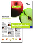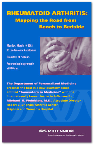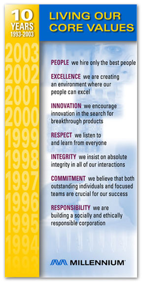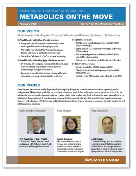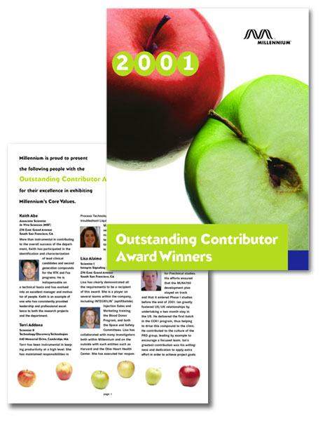 MORE PRINT SAMPLES These pieces were done for Millennium Pharmaceuticals, Inc. as internal advertising pieces. I assisted in a branding initiative that resulted in a new logo, a revised color scheme, a set of proprietary photographs and a revised book of corporate visual standards. I created sets of templates using the new look, co-created and co-taught a training program for adminstrators company-wide. Click on a thumbnail to view a larger image in a new window.