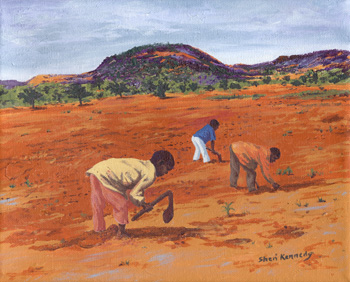 tilling the dry, clay-like soil by hand in preparation for planting